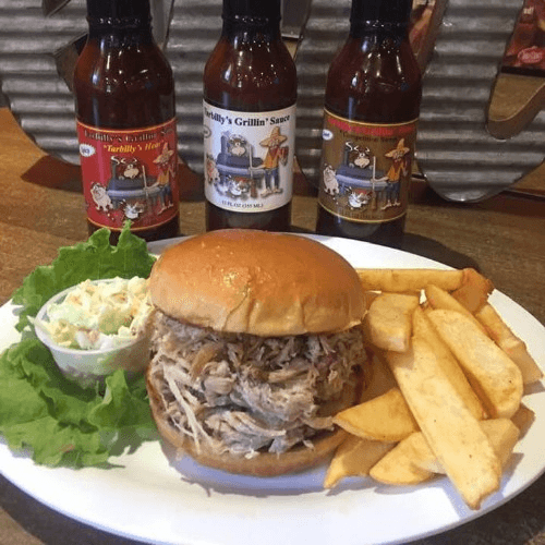Slow smoked, hand pulled pork served on toasted bun with coleslaw on the side