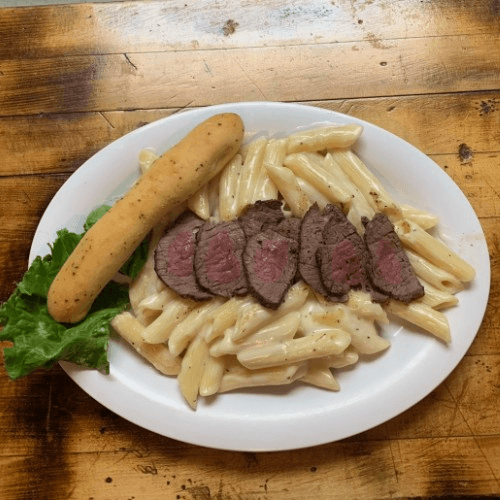 Our creamy alfredo sauce over penne pasta topped with sliced ribeye and served with homemade bread