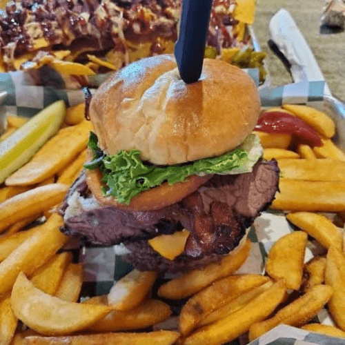 Two ½lb angus patties, American and Swiss cheese, bacon, brisket, bbq sauce, onion rings, lettuce and tomato. Served with side of your choice